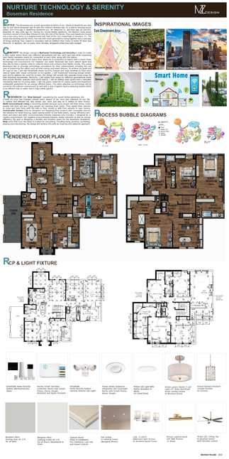 CONCEPT: My design concept for this project was Nurtured Technology and Serenity in order to create a calm space where three very different generations will live, work and play while respecting each family members needs for connection to each other along with the nature.